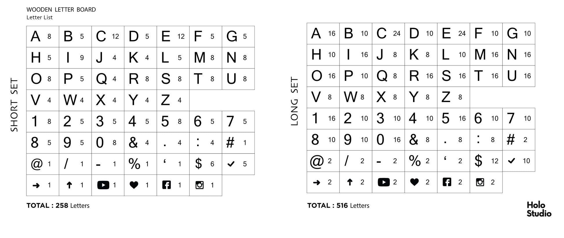 Please see images for the amounts of each letter in the box. You may want to see the full set of Wooden Letter Board, which has wooden rails and more letter tiles with all the other parts you may need to install it on your wall, here is the full set :